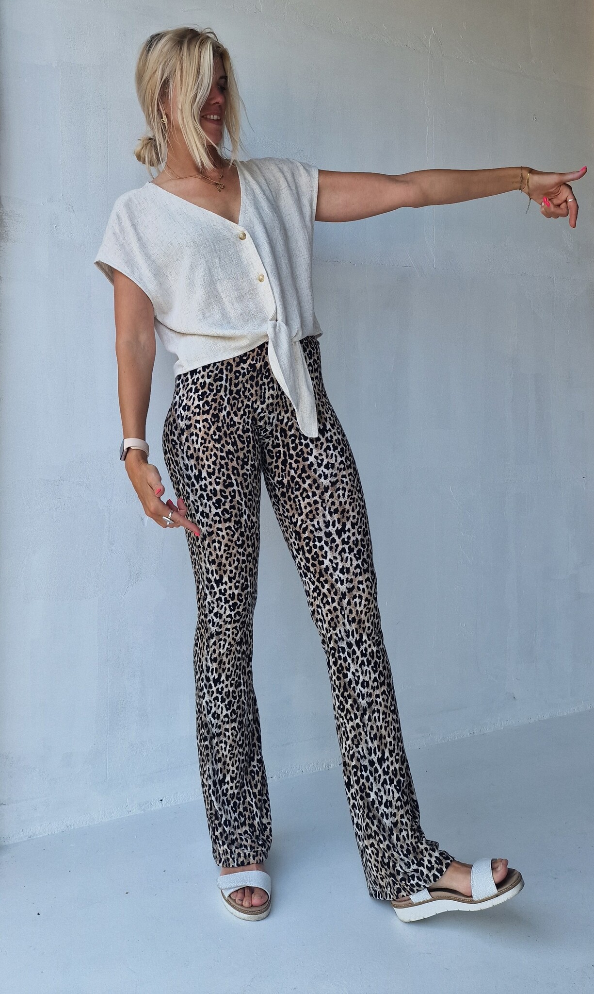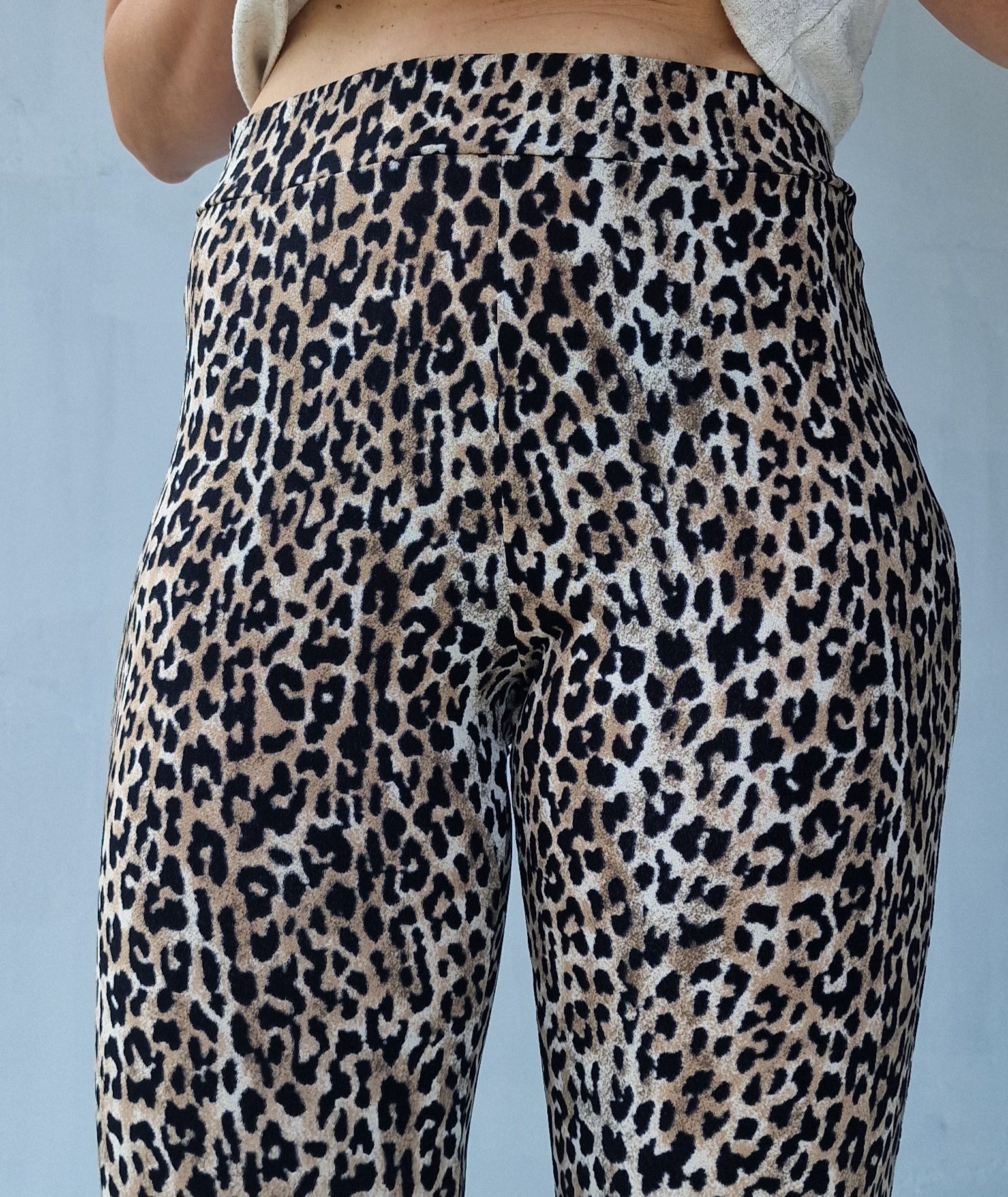 Schöne Schlaghose mit Leopardenmuster aus sommerlichem Stoff. Der Stoff ist elastisch und besteht hauptsächlich aus Polyester mit Elasthan. Der Stoff ist etwas dünner und daher ideal für Frühling, Sommer und Frühherbst.