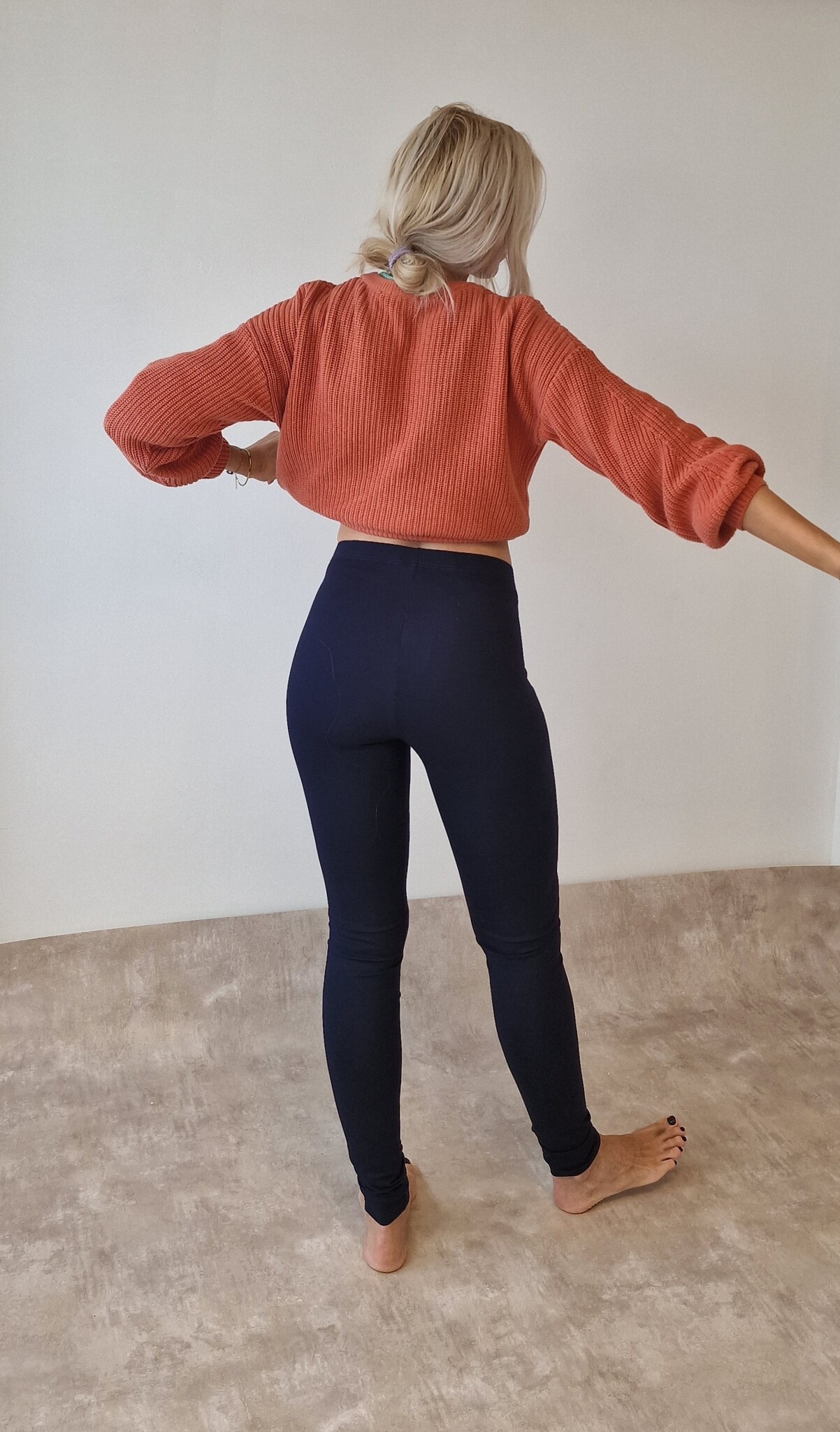 Diese extra langen Leggings haben eine marineblaue Farbe. Die Farbe schmeichelt und sieht in jeder Körperhaltung schick aus. Die Leggings hat einen 3 cm Bund. Die Taille ist etwas höher. Je größer die Konfektionsgröße, desto höher die Taille. Dies bietet zusätzlichen Komfort.
