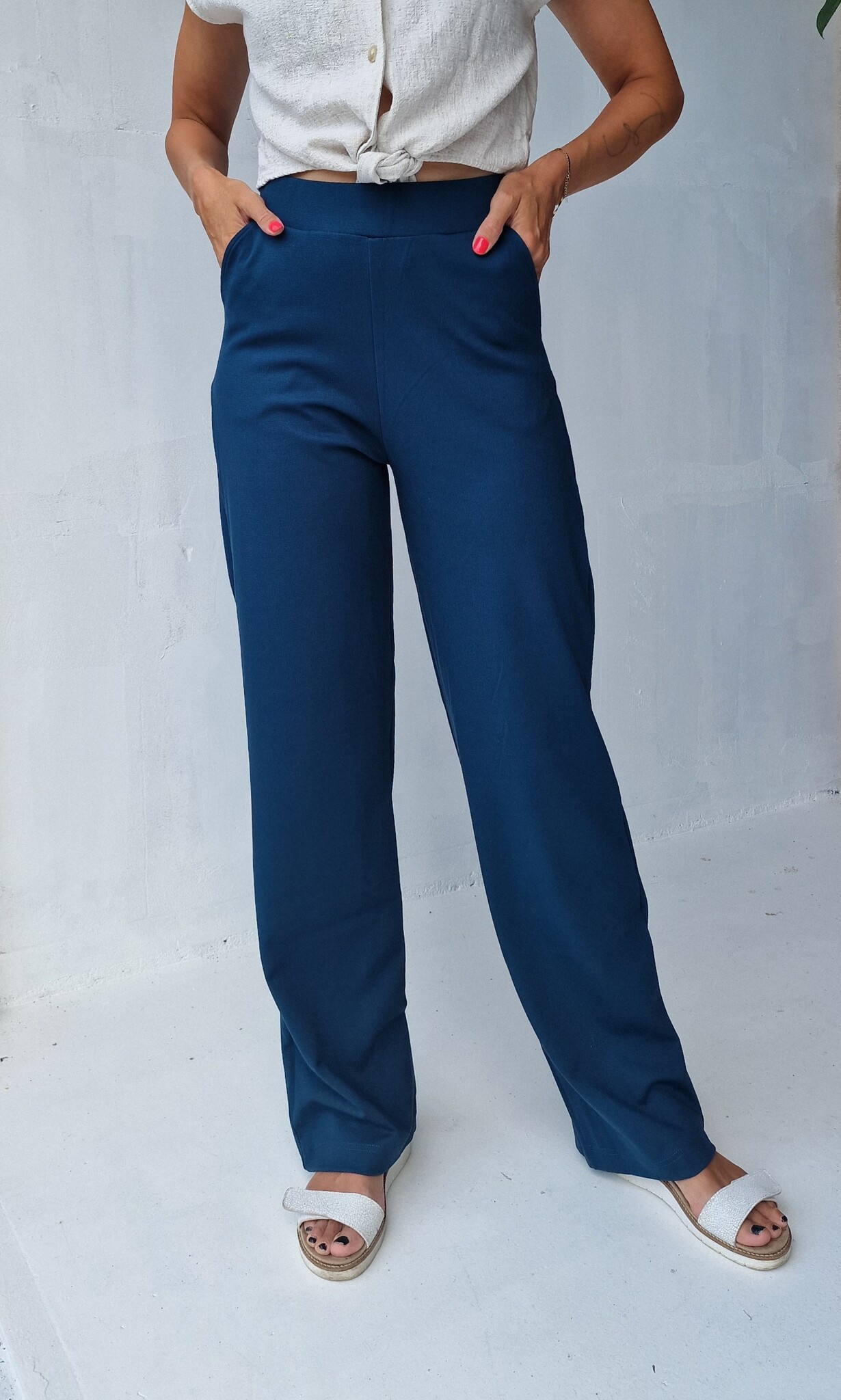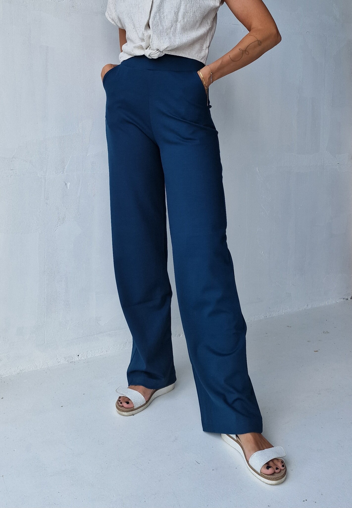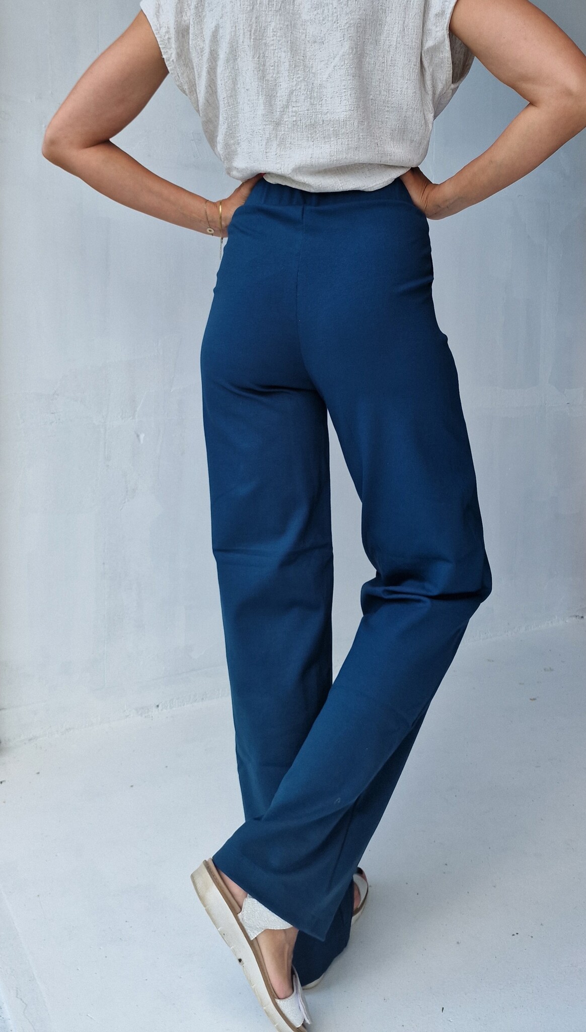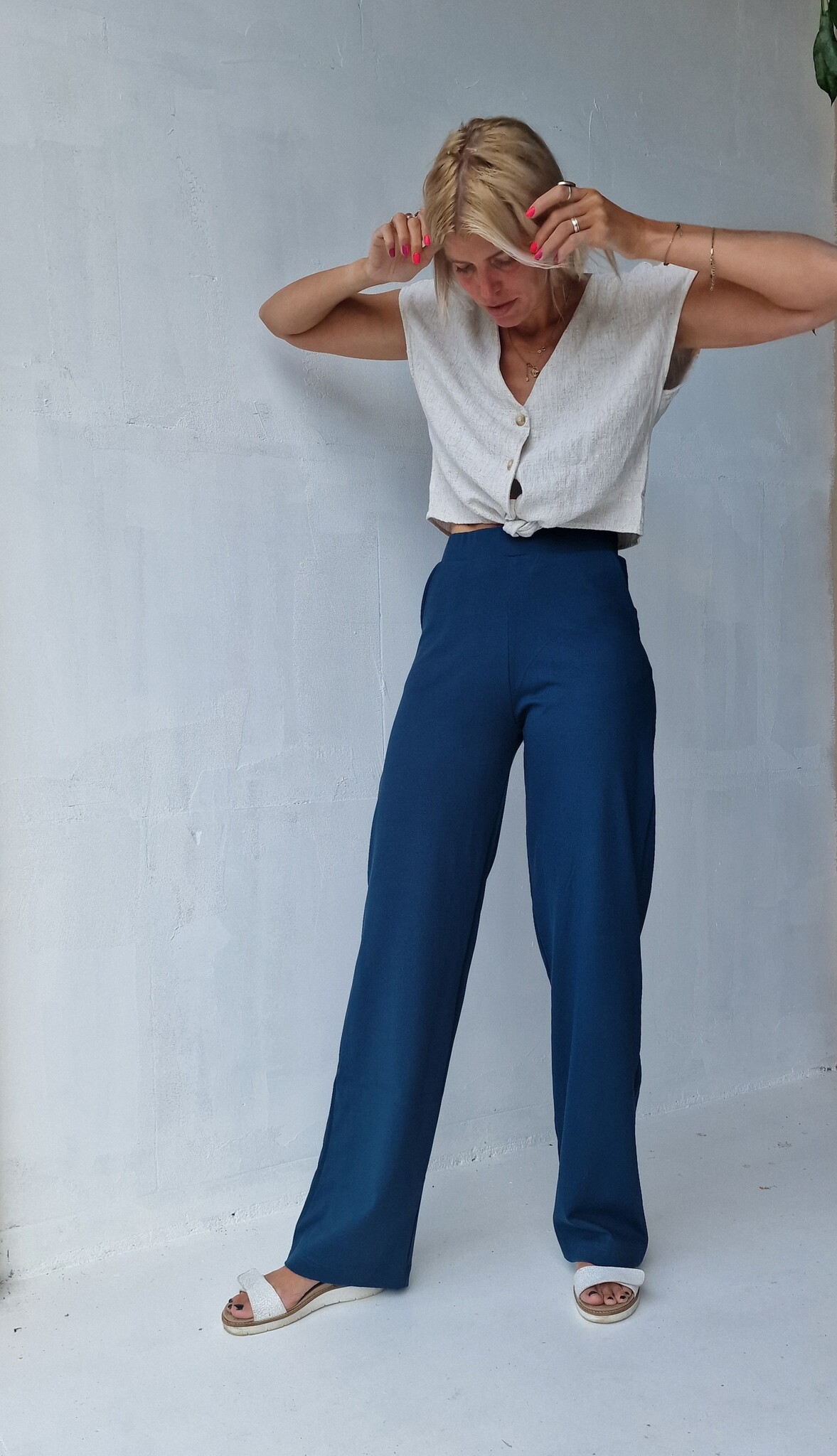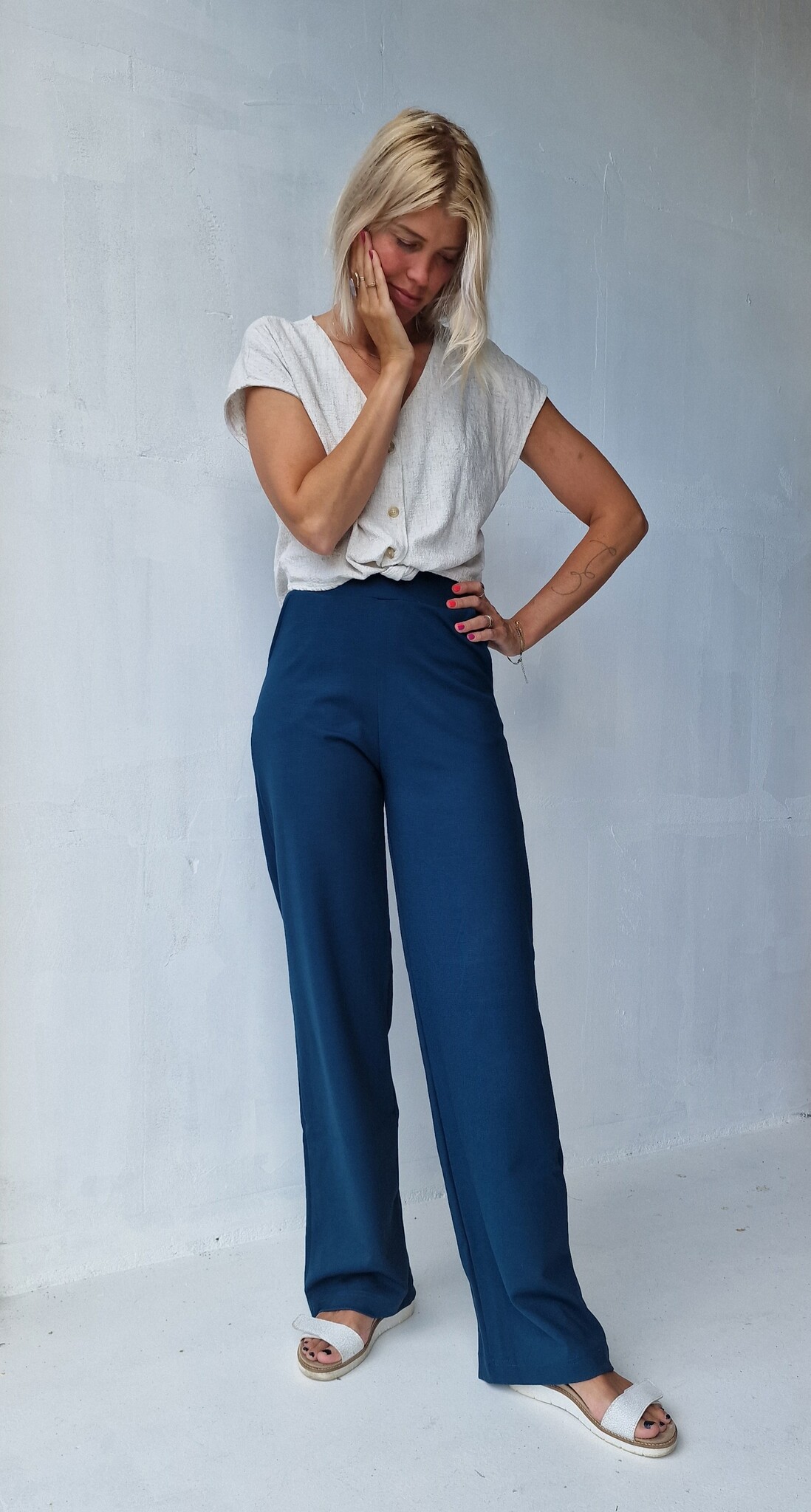 Petrolfarbene Hose mit weitem Bein aus weichem, dickerem Stretch-Stoff. Mit Bund und Seitentaschen. Die Hose hat eine hohe Leibhöhe.