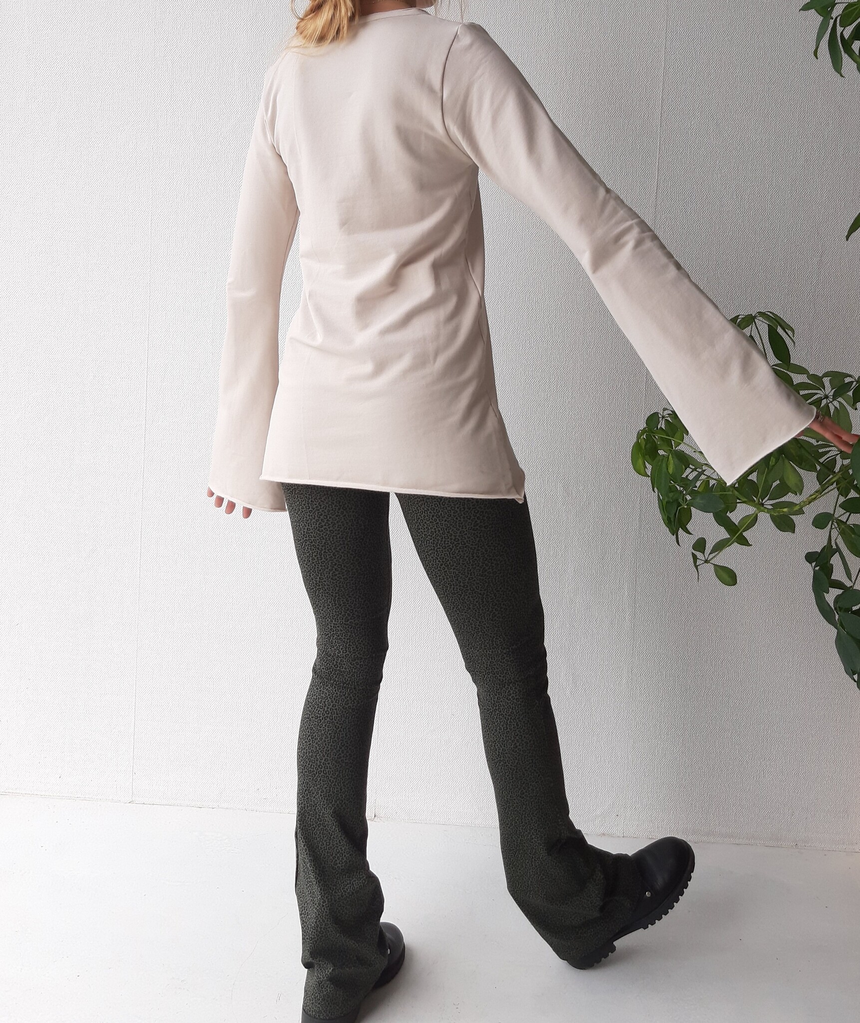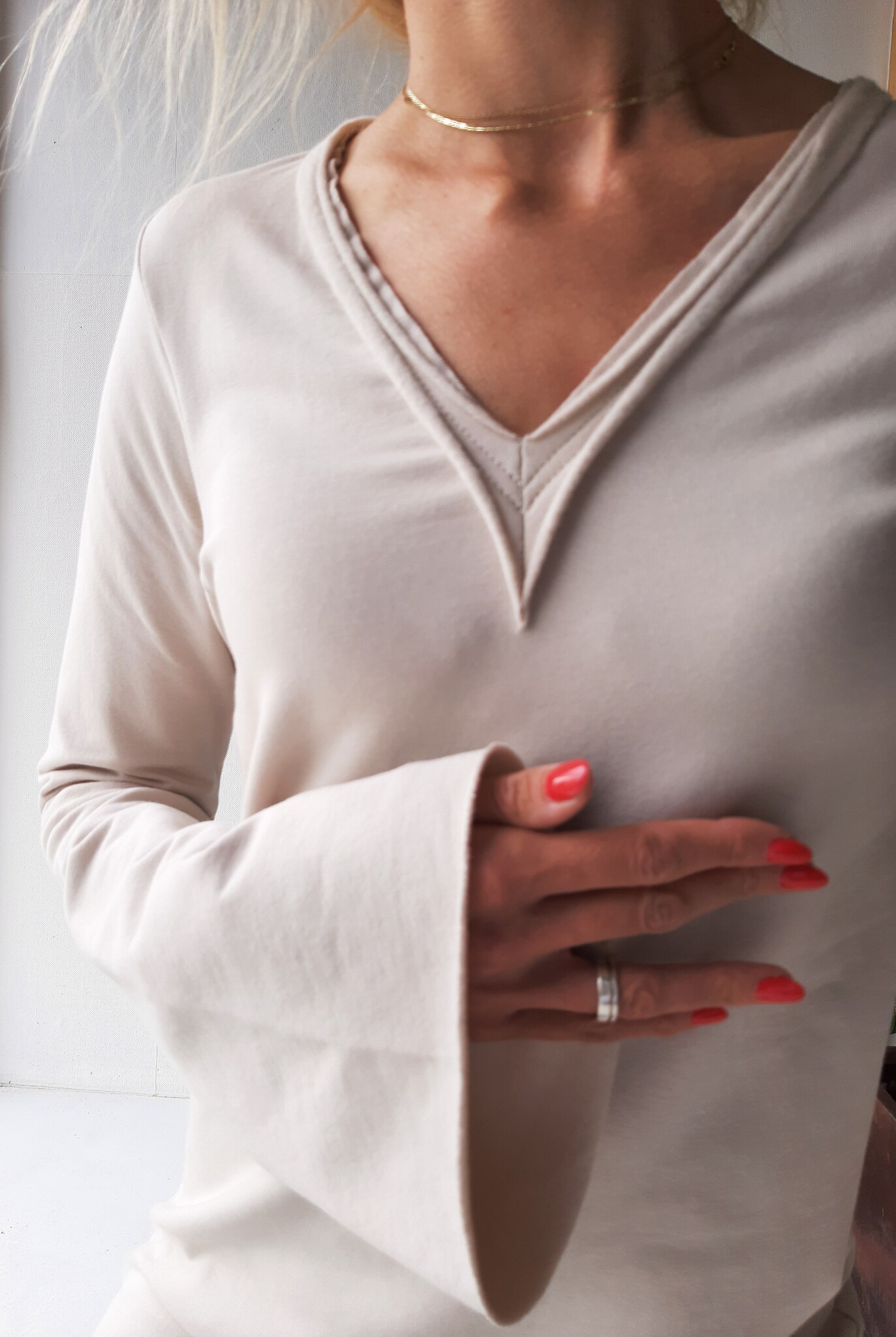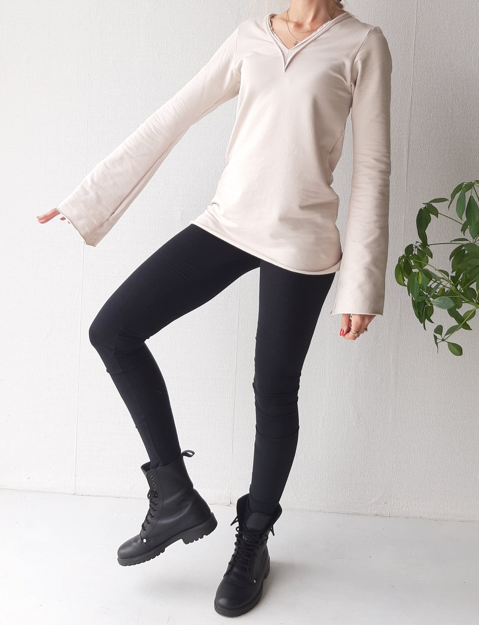 Sale-50%Add to wishlistMadameLizLizzy long sleeve ecru(0) €24,97 €49,95Incl. tax-50% Stock: 2 - 1-2 days S MMaat: *SMAdd to cartLogin for wishlistPay directFree shipping From €50,-Shipped today? You got 00 : 00 : 00DescriptionComfortable sweater with V-neck and diverse sleeve. The sweater has extra length at the sleeves and at the bottom. In addition, the inside is wonderfully soft due to the fleece-like fabric.