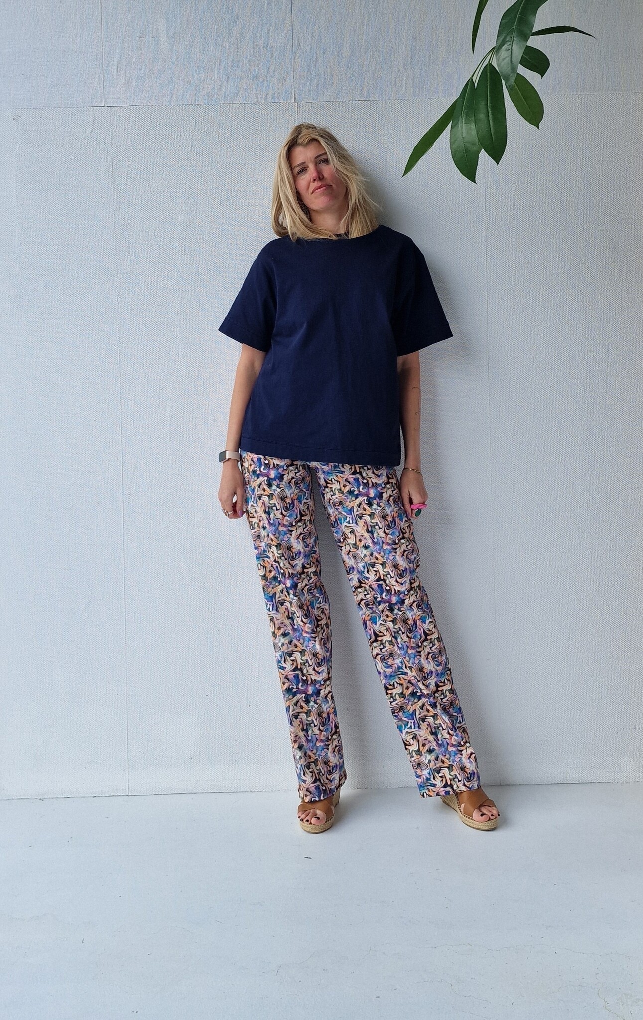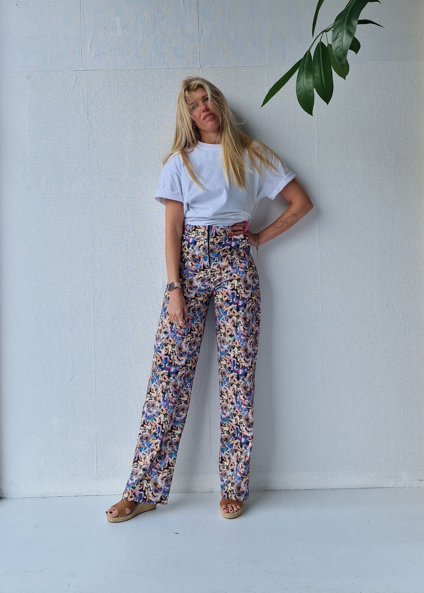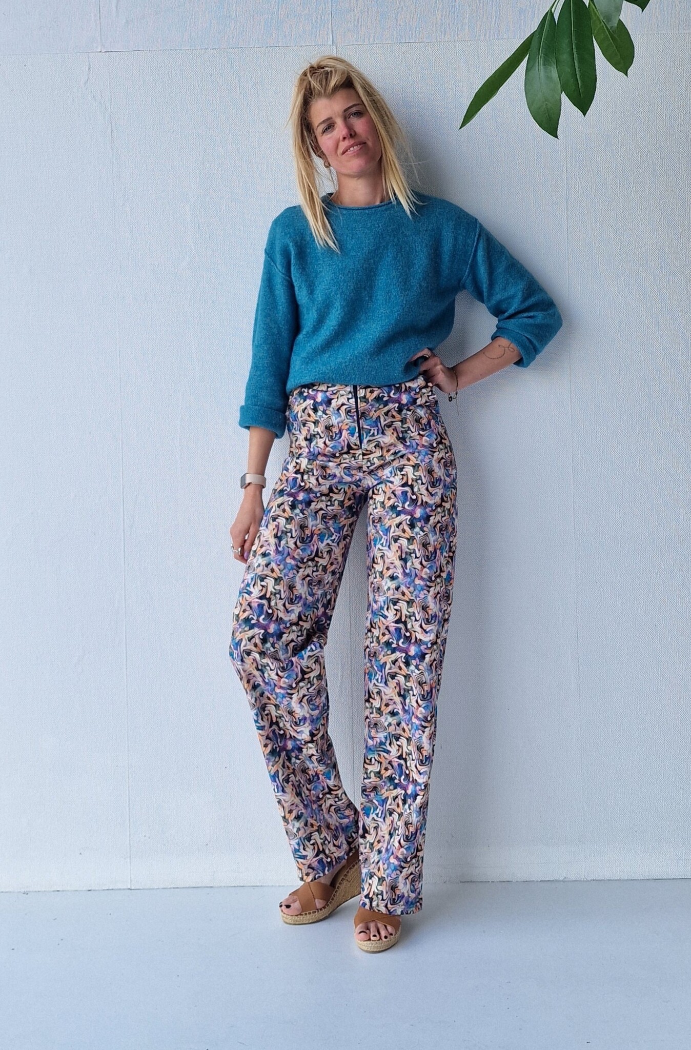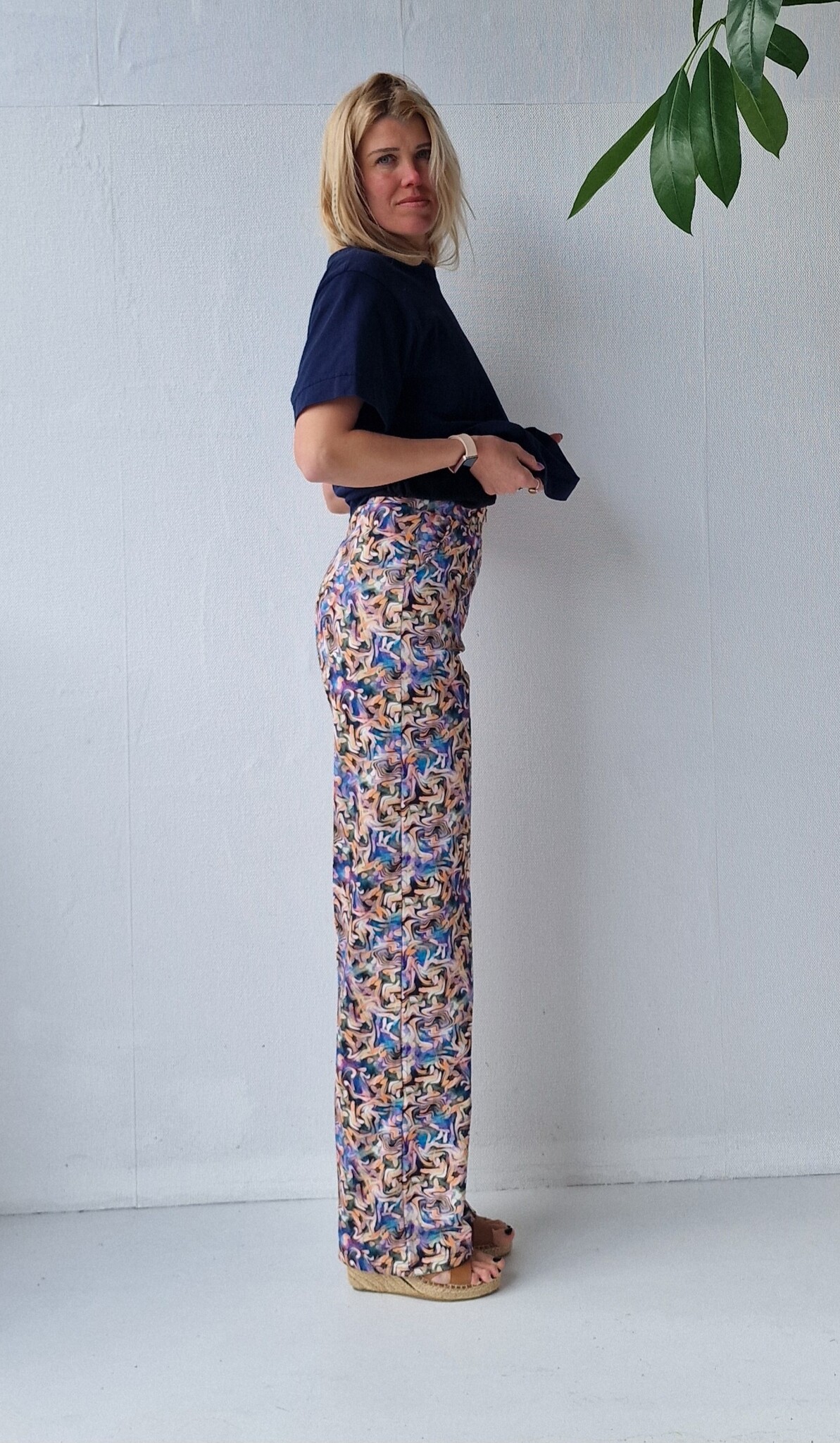 Katoenen straight/ wide leg van semi jeans - achtige stof met stretch. Met tailleband en zijzakken. Deze broek heeft een rits aan de voorzijde wat hem iets meer 'body' geeft. Deze broek heeft een high rise/high waist/hoge taille.