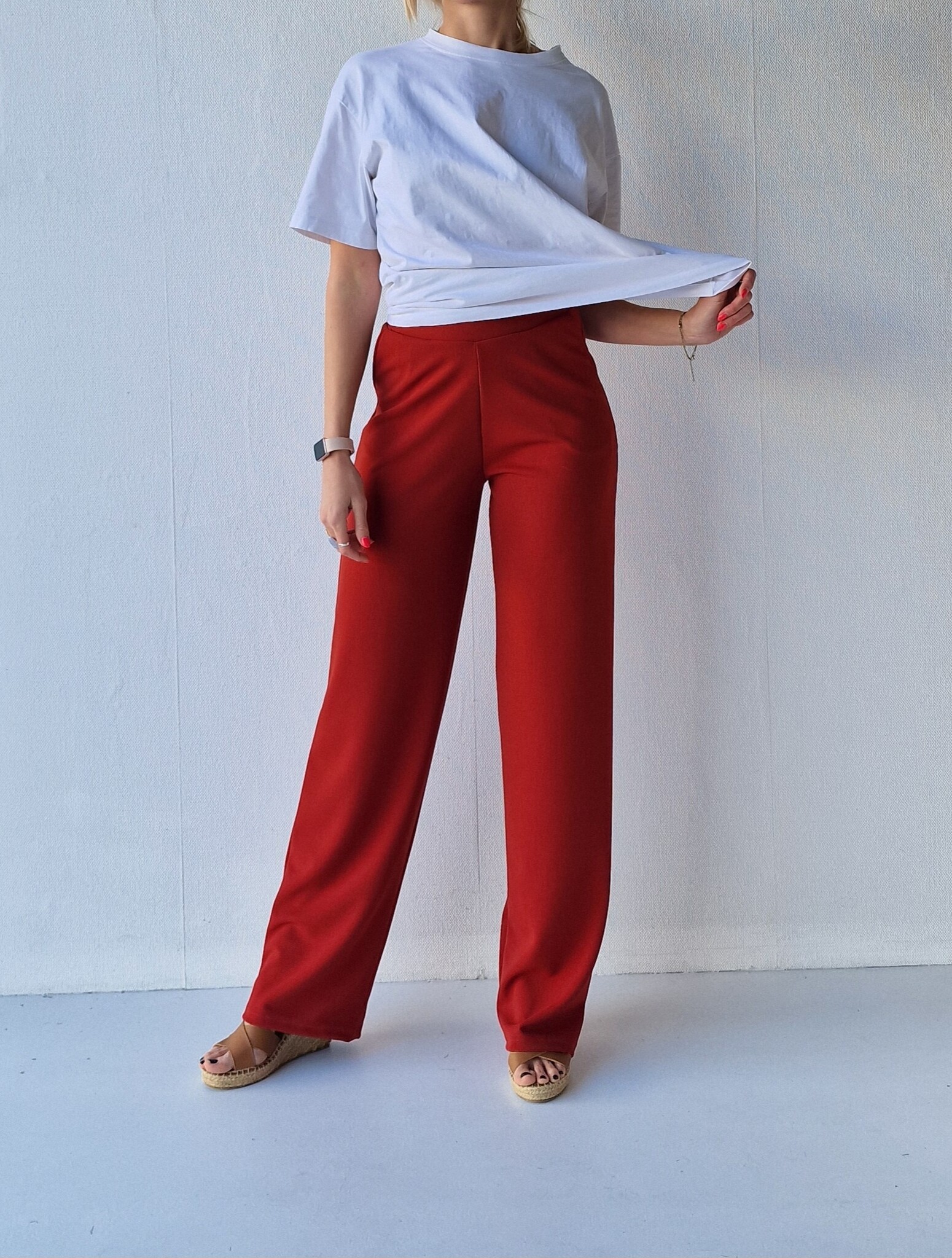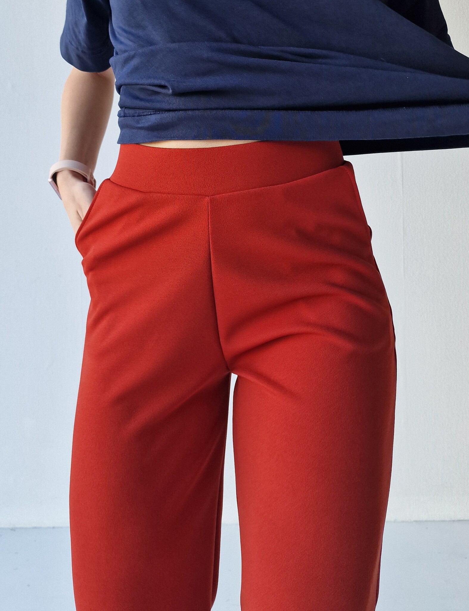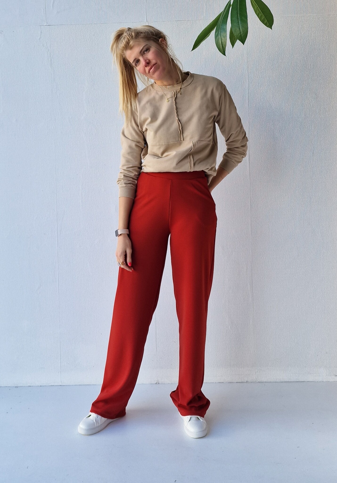 Roestkleurige wide leg van crêpe - achtige stof met stretch. Met tailleband en zijzakken. Deze broek heeft een high rise/high waist/hoge taille.